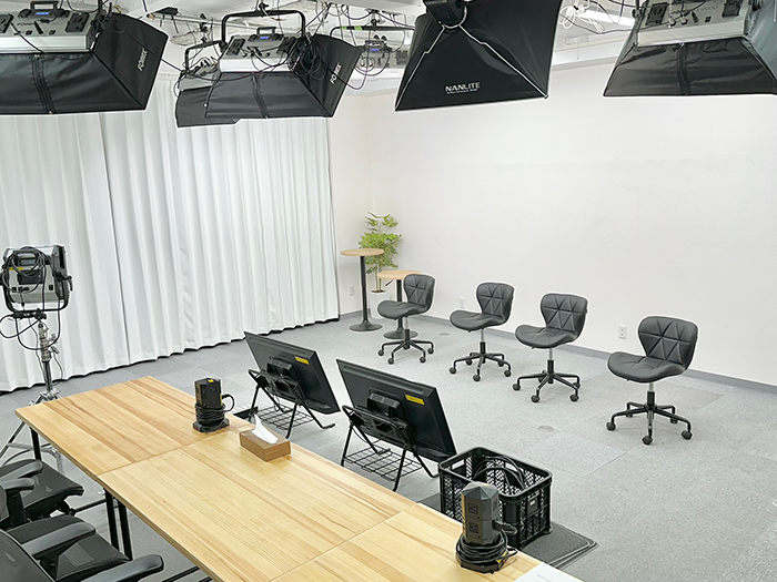 【配信・収録スタジオ】広さ約80㎡、LED照明8機、NURO biz専用線×2回線